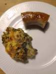 Ølkogt medister med kartoffelmos m. stegte grøntsager og ost